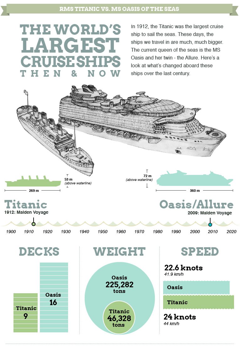 I sailed on Allure last month, she is longer but lighter than her sister. Also both “weights” are wrong. The listed “weight” is gross tonnage which measures the enclosed volume of a ship. Weight can be found by comparing displacement of water. The displacements for Titanic and Oasis-class are 52,310 tons and 105,000 tons respectively.