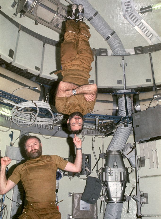 Astronaut Gerald P. Carr, Commander for the Skylab 4 mission, jokingly demonstrates weight training in zero-gravity as he balances astronaut William R. Pogue, pilot, upside down on his finger.